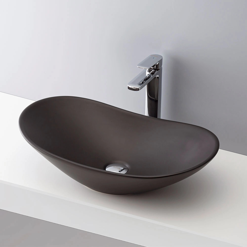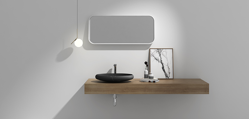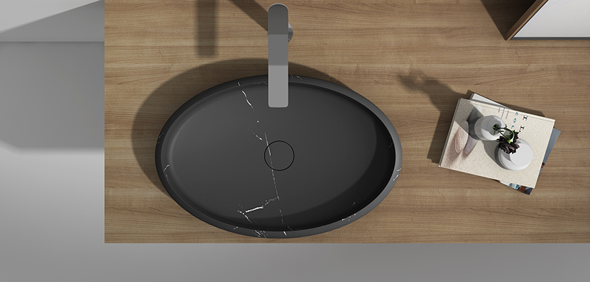 人工大理石のマットな質感が最高の魅力。繊細なディテールのエッジとなめらかな曲線が、バスルーム空間や洗面所のインテリアの品格と高級感を高めます。きわめてシンプルなデザインは、インテリア空間を自分色に仕上げるために最適なアイテムです。